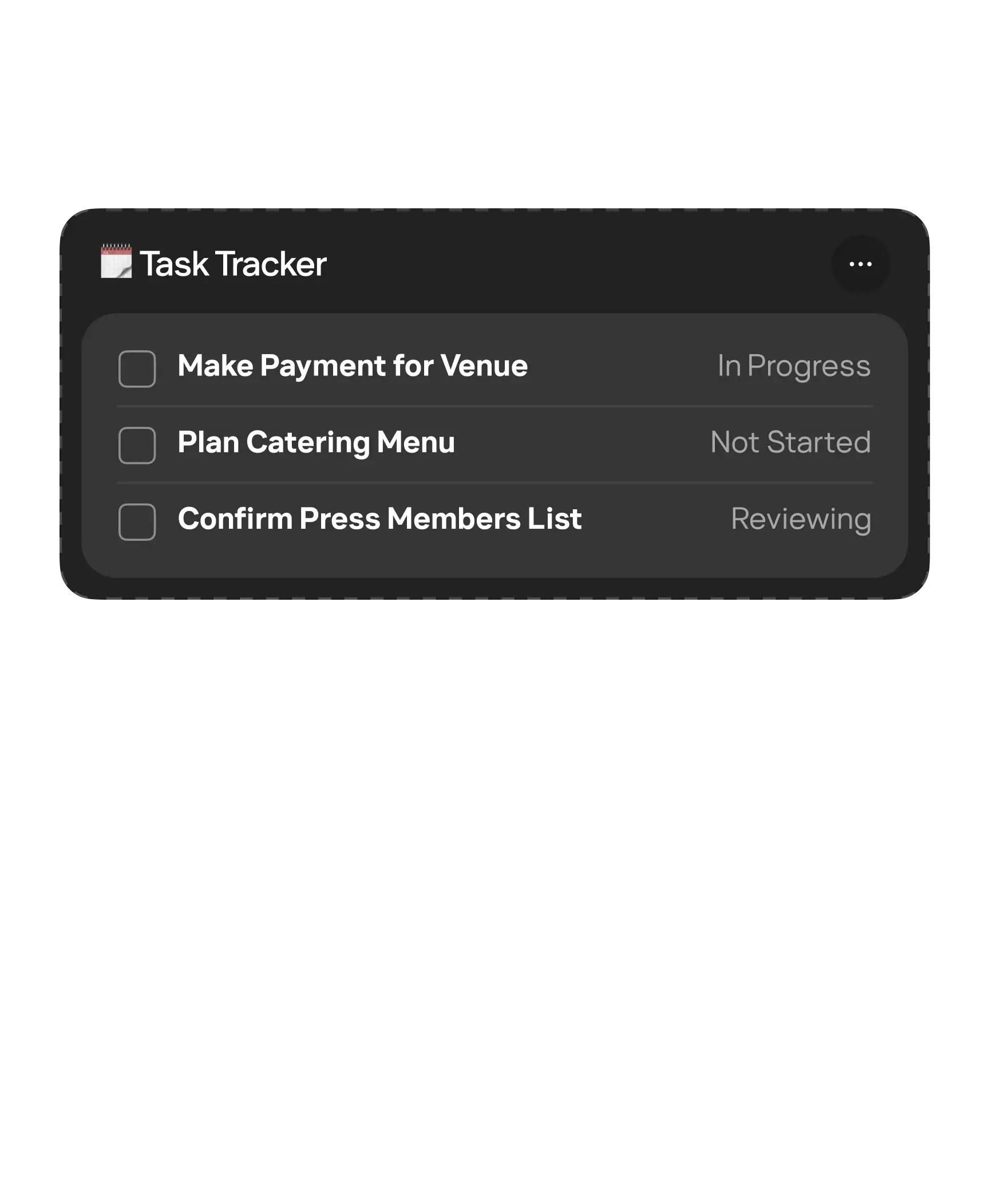 Search, assign, and manage trusted vendors for each event. Confirm availability, track deliverables, and cut down on endless calls and chats.